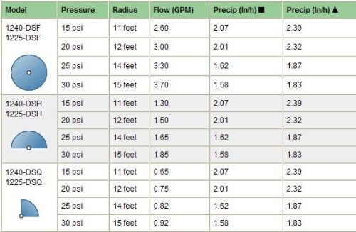 These sprinkler heads have an increased radius of approximately 10 ft and can be spaces about 20 ft apart. Sprinkler head types and sprinkler repair. The operating pressure is 25 psi (2 bars) and radius of throw is 11 feet (3.3528 m).